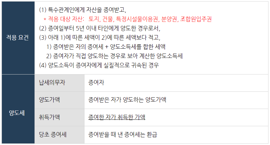증여를 통해 세액이 감소했는지 여부를 따져서 이에 해당하는 경우에만 "부당행위"로 보아 규정을 적용하며, 양도소득세 납세의무자가 "증여받은 자" 가 아닌 "증여자"로 바뀌어 버립니다.